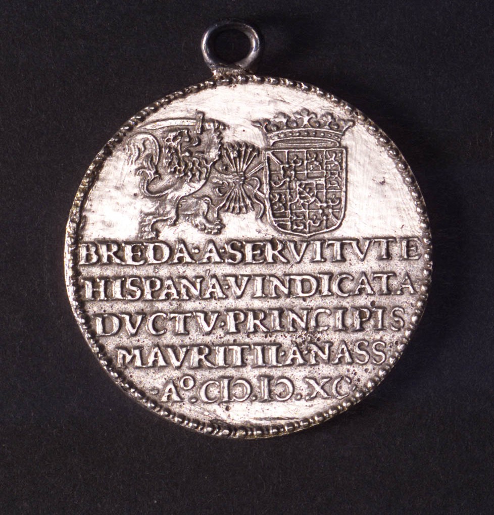 Counter commemorating the capture of Breda, 1590. Counter commemorating the capture of Breda, 1590. Obverse: Five soldiers armed with spears landing from a boat. Legend: 'PARATI . VINCERE . AVT . MORI . 4 . MARTII. INVICTI . ANIMI . PR.' Revers