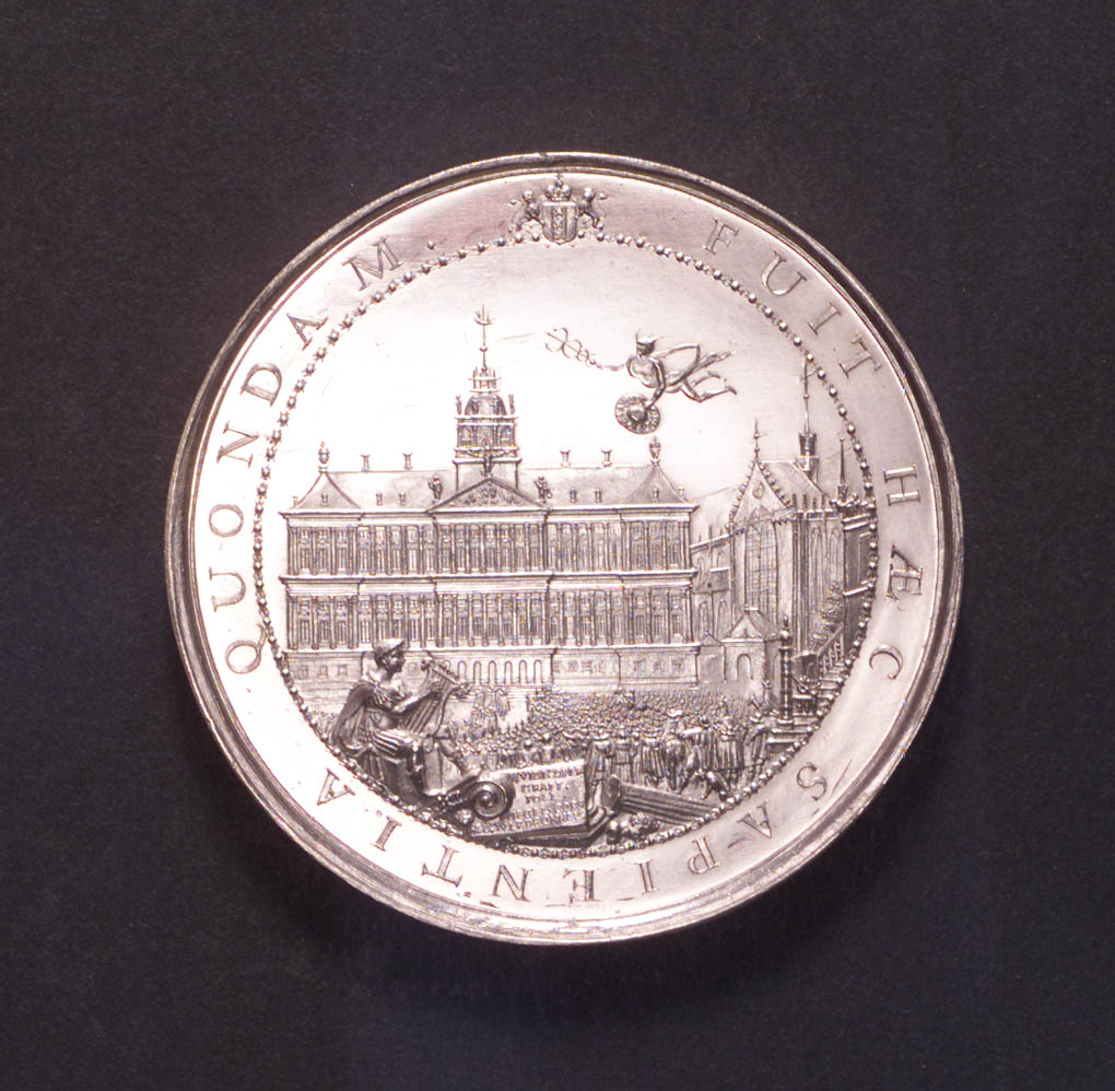 Medal commemorating the inauguration of the City Hall of Amsterdam, 1655. Medal commemorating the inauguration of the City Hall of Amsterdam, 1655. Obverse: View of the city hall, Amsterdam, Amphion playing the lyre and figures in foreground, Mercury fly