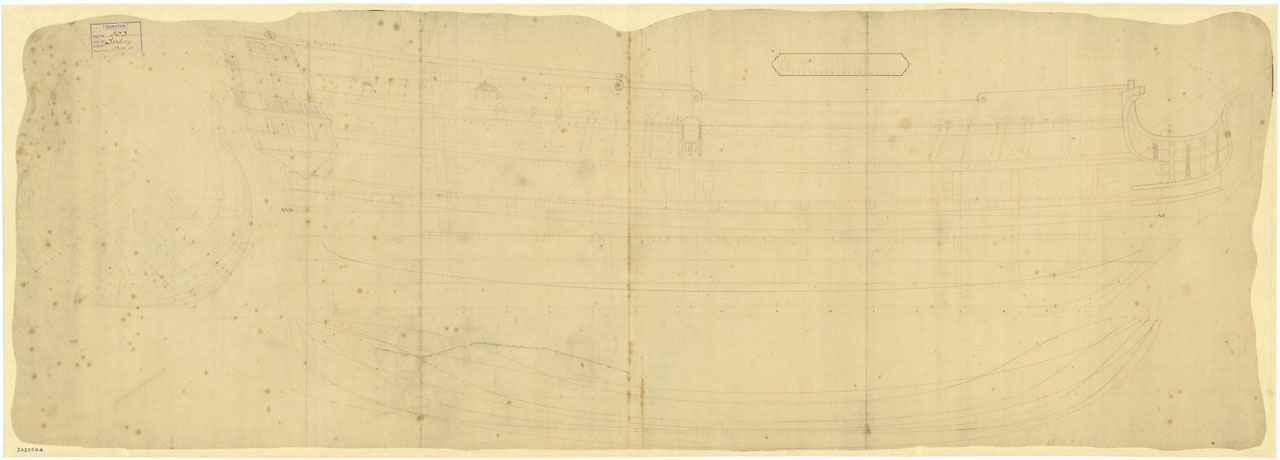 Medway (1718). Scale: 1:48. Plan showing the body plan, sheer lines with inboard detail, and longitudinal half-breadth proposed (and approved) for Medway (1718), a modified 1706 Establishment 60-gun Fourth Rate, two-decker.