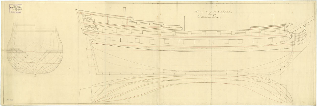 Cumberland (1739). Scale: 1:48. Plan showing the body plan, sheer lines with some inboard detail, and longitudinal half-breadth for Cumberland (1739), a 1733 Establishment 80-gun Third Rate, three-decker. A copy of this plan was sent to Woolwich Dockyard