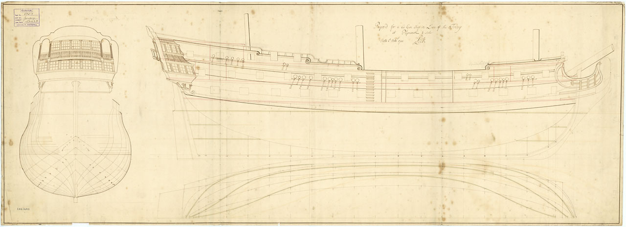 Jersey (1736). Scale: 1:48. Plan showing the body plan, stern board outline with some decoration detail, sheer lines, and longitudinal half-breadth proposed for building Jersey (1736), a 60-gun Fourth Rate, two-decker.