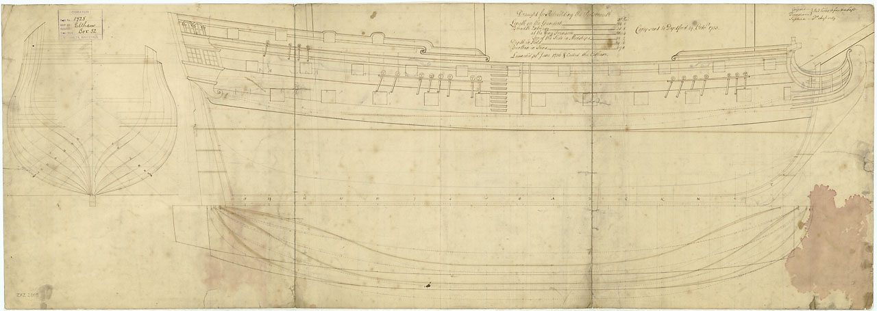 Eltham (1736); Gosport (1741); Faversham (1741); Saphire (1741) [also spelt: Saphire]. Scale: 1:48. Plan showing the body plan, sheer lines, and longitudinal half-breadth for Eltham (1736), a 1733 Establishment 44-gun Fifth Rate, two-decker. The plan in