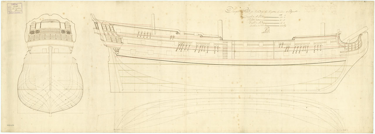 Kingston (1740). Scale: 1:48. Plan showing the body plan, stern board outline with some decoration detail, sheer lines, and longitudinal half-breadth proposed (and approved) for Kingston (1740), a 60-gun Fourth Rate, two-decker. This ship was built to r