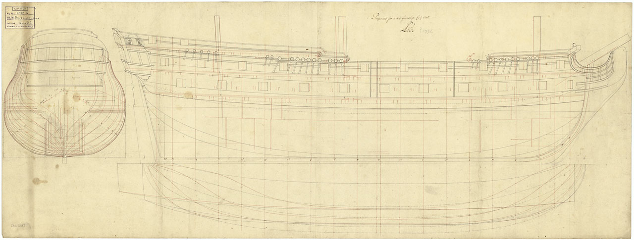 Woolwich (1741). Scale: 1:48. Plan showing the body plan, sheer lines, and longitudinal half-breadth proposed (and approved) for building Woolwich (1741), a 1733 Establishment 50-gun Fourth Rate, two-decker.