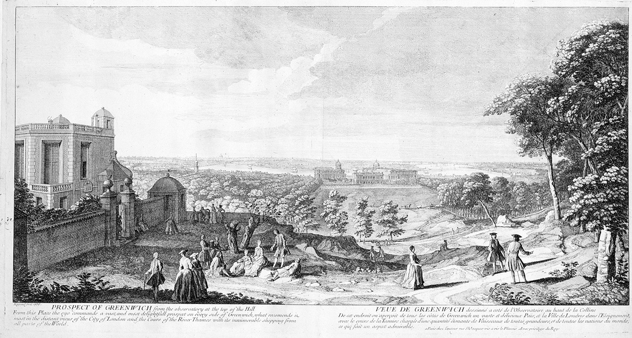 'Prospect of Greenwich from the observatory at the top of the Hill ... distant views of London and the cours of the River Thames...'. This view north-east over the Park, Greenwich Hospital and the Thames, with London in the left distance, is one