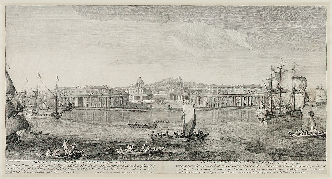'Prospect of Greenwich Hospital from the River...The Old Royal House where the Governor resides stands at the farther end of it at the entrance to Greenwich Park'. This print is almost certainly derived from the drawing also in the collection, P