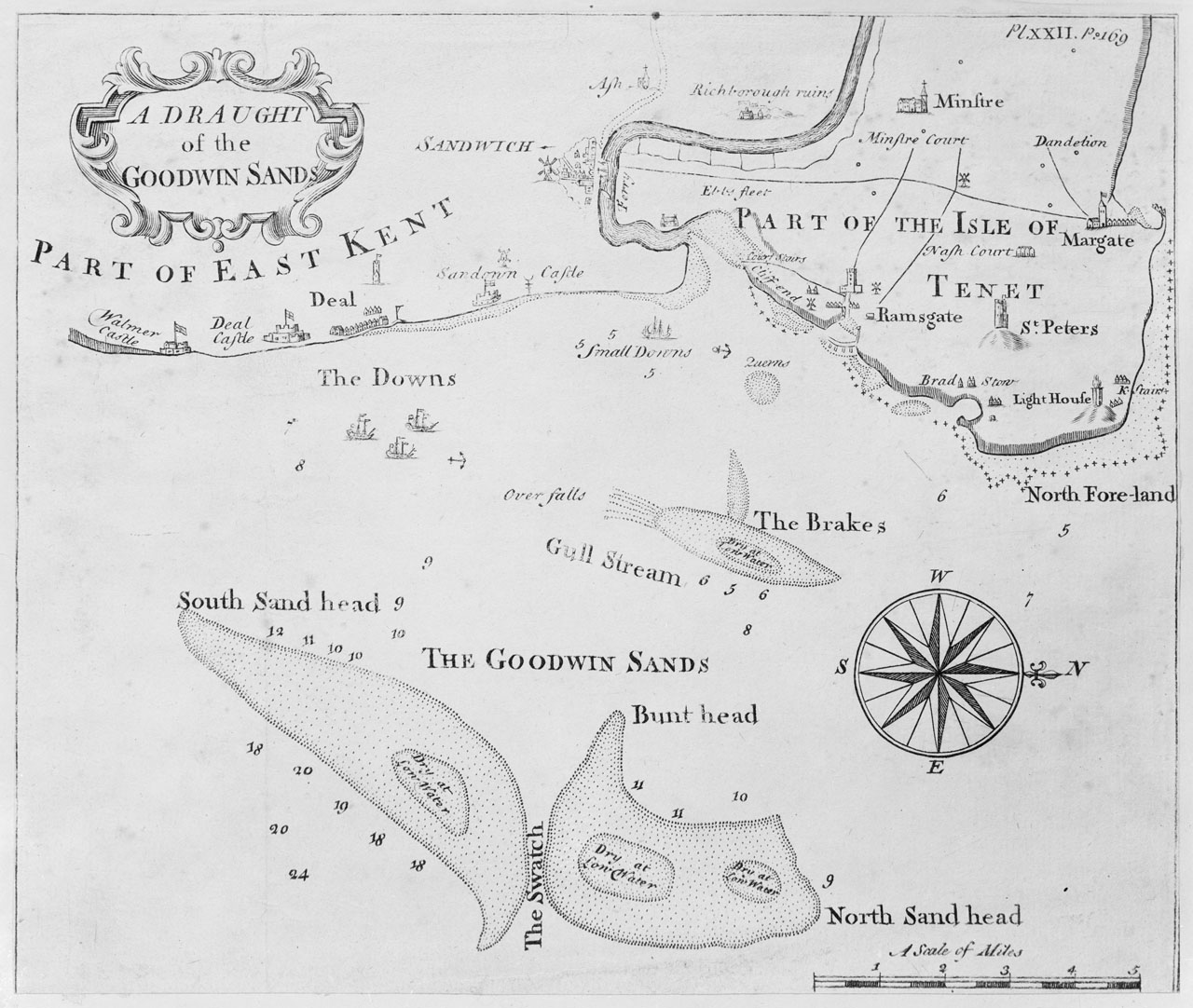 A draught of the Goodwin Sands Pl.XXII P169. Scale: 1:125,000 (bar). Printed chart of the North Sea, the Goodwin Sands, and part of the Isle of Thanet. Ungraduated chart. Diagrams of prominent landmarks and towns, including Deal, Sandwich and Ramsgate. Ed