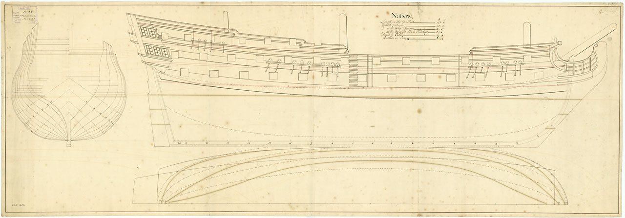 'Nassau' (1740). Scale: 1:48. Plan showing the body plan, sheer lines, and longitudinal half-breadth for rebuilding 'Nassau' (1707) at Chatham Dockyard as 'Nassau' (1740), a 1733 Establishment 70-gun Third Rate, two-decker.