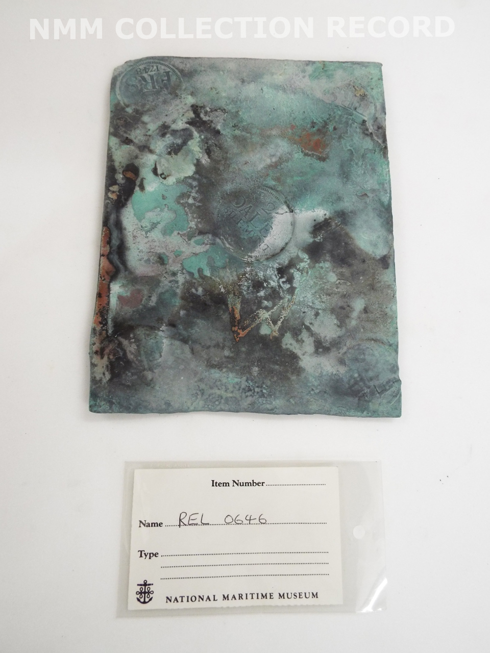 Plate money square. Plate money. Roughly square copper plate. Stamped 'FRS 1748', '2 DALER SILF MYNT'. Cancelled Swedish copper being exported as bullion. From the wreck of an unidentified merchantman circa 1780-1815, found in the Sout