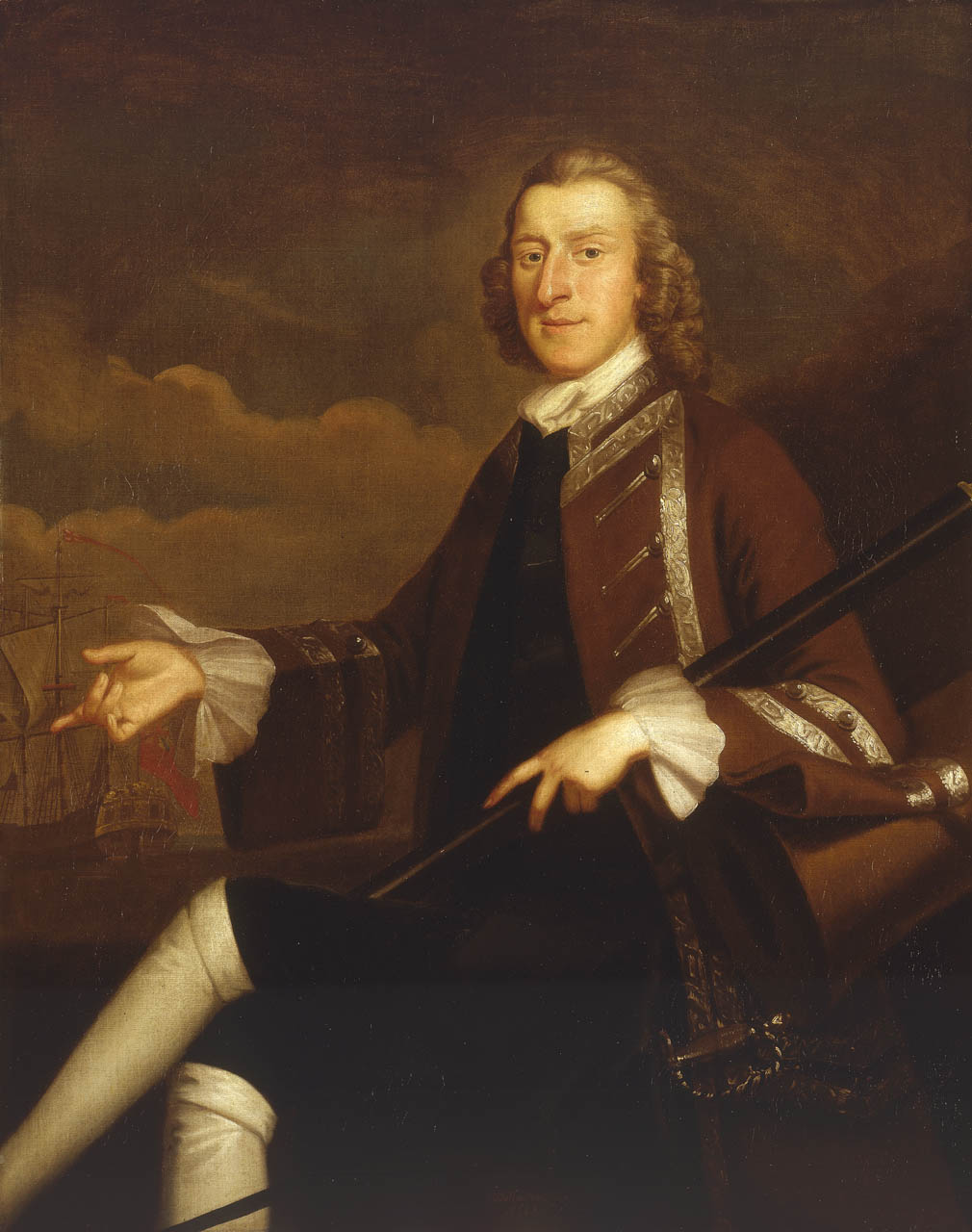 Captain the Honourable George Edgcumbe, 1720-95. A three-quarter-length portrait wearing captain's full-dress uniform, 1748-67. He wears his own hair, tied in a bow at the back and a waistcoat and cuffs edged in gold. He holds the hilt of his sword i