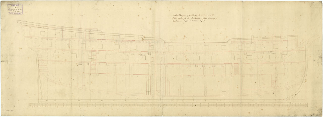 Egmont (1768). Scale: 1:48. Plan showing the body plan, sheer lines, and longitudinal half-breadth for building 'Egmont', a 74-gun Third Rate, two-decker at Deptford Dockyard.