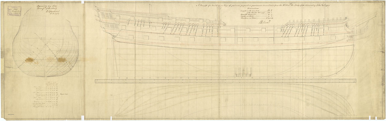 Intrepid (1770). Scale: 1:48. Plan showing the body plan, sheer lines, and longitudinal half-breadth proposed (and approved) for Intrepid (1770), a 64-gun Third Rate, two-decker. The plan includes a table of mast and yard dimensions. The later alteratio