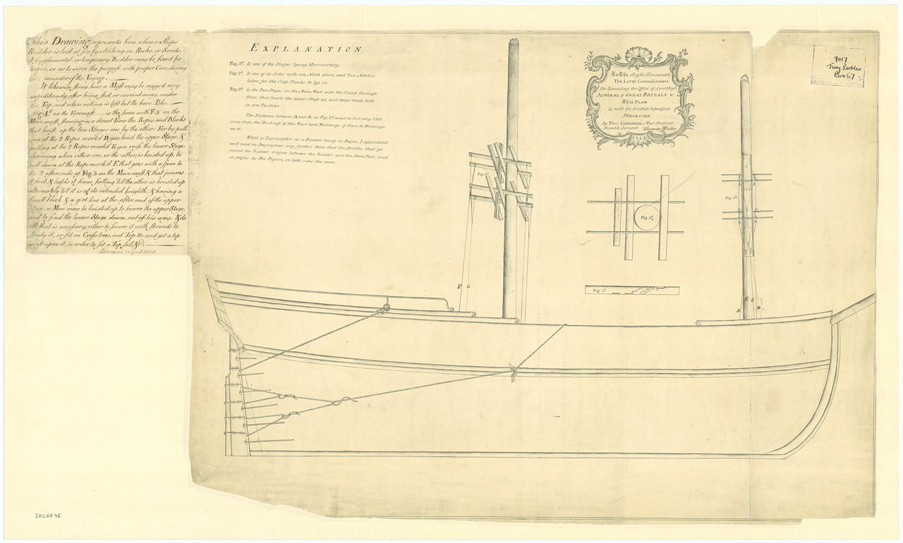 Tamar (1758). Scale: 1:48. Plan showing the body plan, an outboard profile and plan view of the Tamar (1758), a 16-gun ship sloop. The plan specifically illustrates the jury rudder made on the return voyage to Britain after she lost her rudder through e