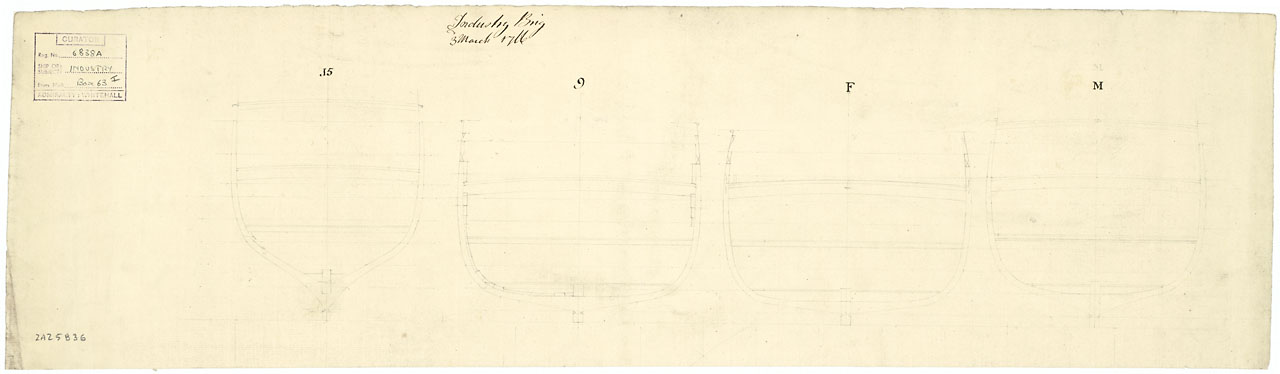 'Industry' (fl.1765). No scale. A plan showing the sections at frames fifteen, nine, F, and M for the 'Industry' (fl.1765), a 6-gun brig to lie in the Bar of Senegal, as a floating battery.