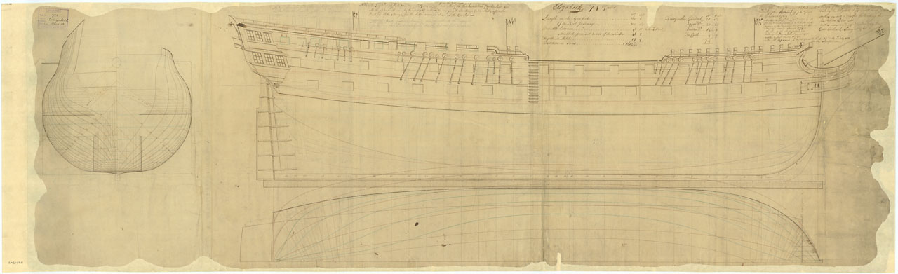 Salisbury (1769). Scale: 1:48. Plan showing the body plan, sheer lines with quarter decoration, and longitudinal half-breadth proposed (and approved) for Salisbury (1769), a 50-gun Fourth Rate, to-decker.