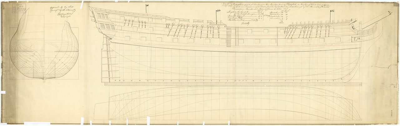 Carysfort (1766). Scale 1:48. Plan showing the body plan, sheer lines, longitudinal half breadth for Carysfort (1766), a 28-gun, Six th Rate Frigate building at Sheerness Dockyard.