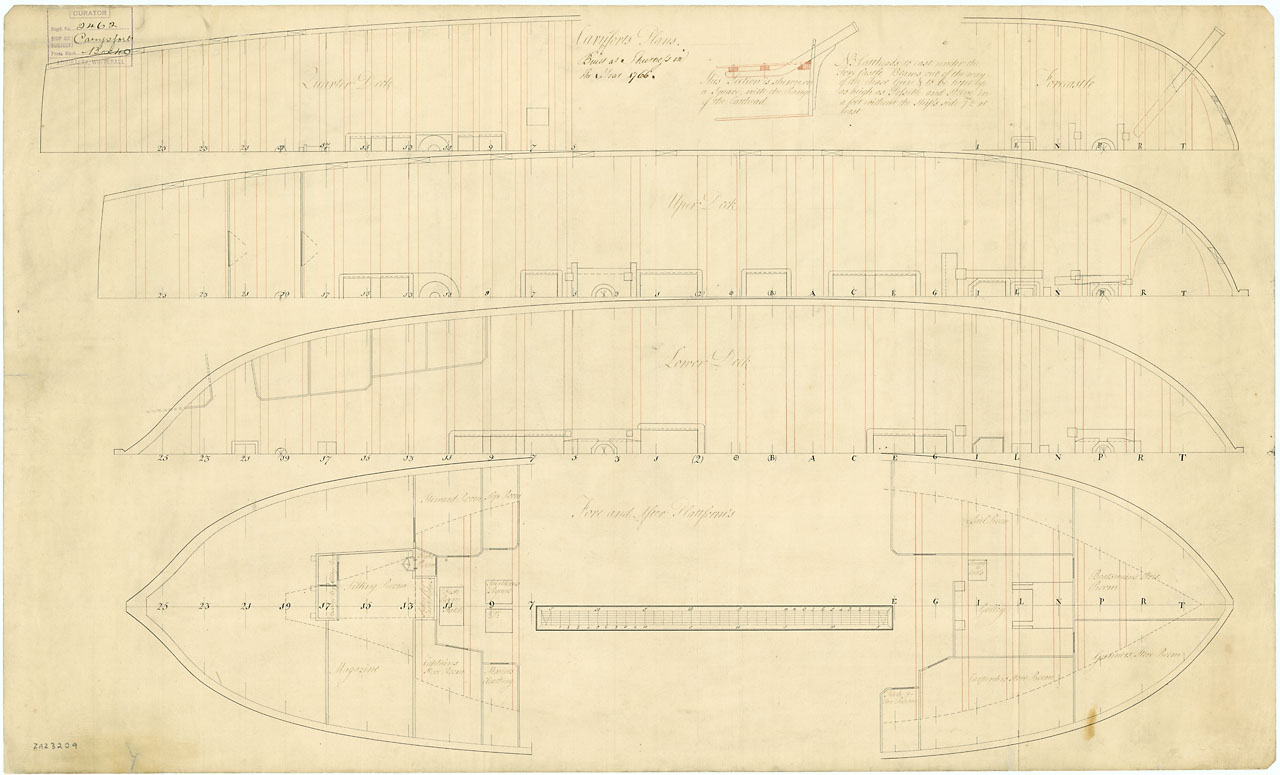 Carysfort (1766). Scale 1:48. Plan showing the inboard profile for Carysfort (1766), a 28-gun, Six th Rate Frigate building at Sheerness Dockyard.