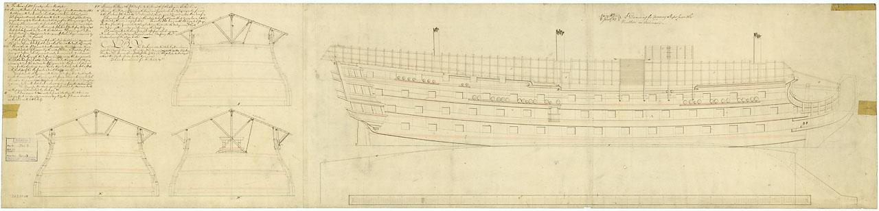Majestic (1785); Orion (1787); Captain (1787). Scale: 1:48. Plan showing the inboard profile for building Majestic (1785), Orion (1787), and Captain (1787), all 74-gun Third Rate, two-decker. Copies of this with the plans were sent to the respective Merch