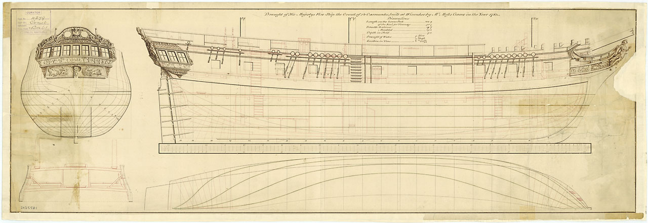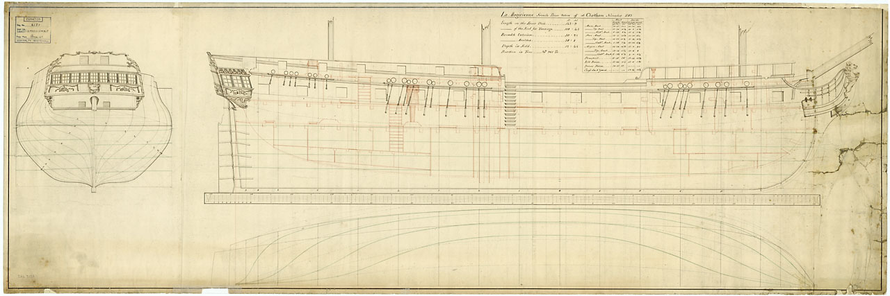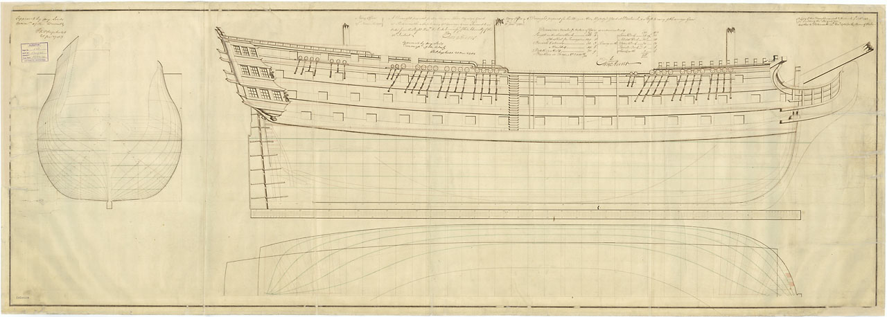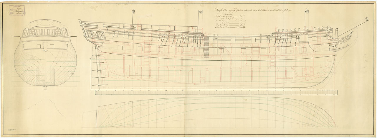 'Latona' (1781). Plan showing the body plan, sheer lines, and longitudinal half-breadth for Latona (1781). CHECK DATE OF PLAN