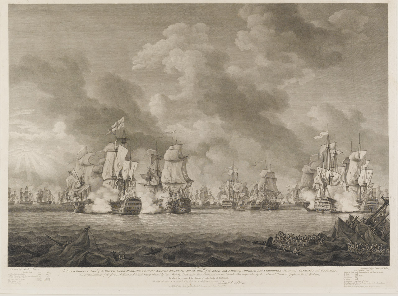 The Battle of the Saints, 12 April 1782 – breaking the line. Inscribed: “To Lord Rodney Adml. of the White, Lord Hood, Sir Francis Samuel Drake Bart. Rear Admls of the Blue, Sir Edmund Affleck Bart. Commodore, The several Captains and Officers