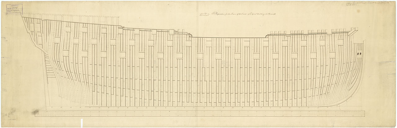 'Caesar' (1793). Scale 1:48. Plan showing framing profile (disposition) for 'Caesar' (1793), an 80-gun Third Rate, two-decker.