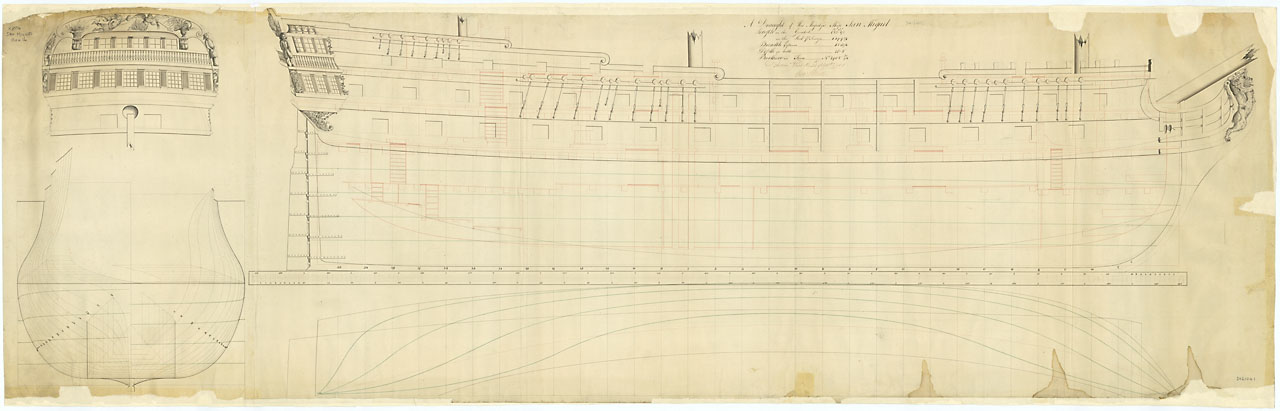 'Nassau' (1785). Scale: 1:48. Plan showing the inboard for 'Nassau' (1785) a 64-gun Third Rate, two-decker, building at Bristol by Mr Hilhouse.
