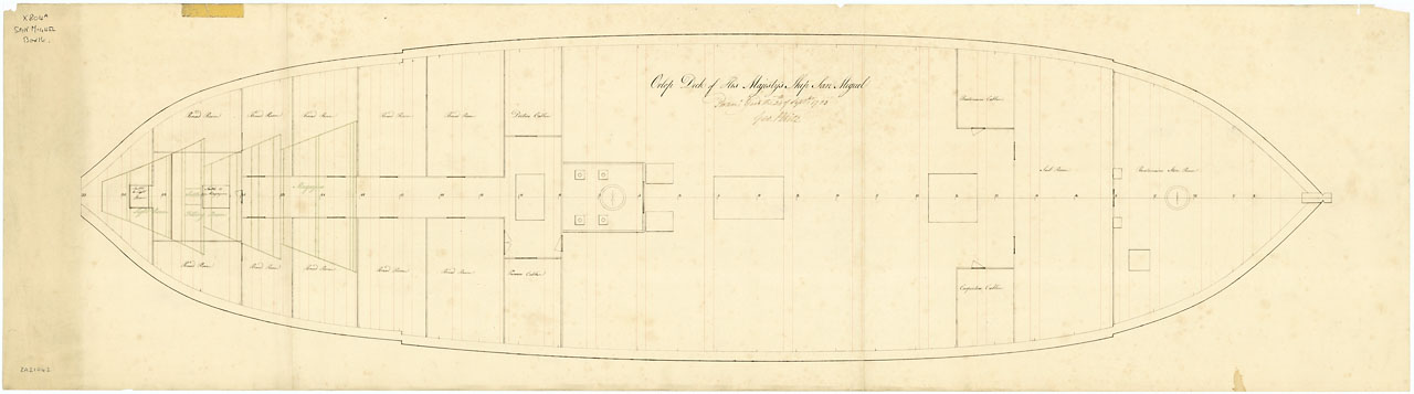 'San Miguel' (1782). Scale: 1:48. Plan showing the upper deck for 'San Miguel' (1782), a captured Spanish Third Rate, as taken off at Portsmouth Dockyard prior to fitting as a 74-gun Third Rate, two-decker.