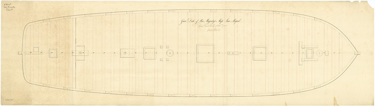 'San Miguel' (1782). Scale: 1:48. Plan showing the gun deck (lower deck) for 'San Miguel' (1782), a captured Spanish Third Rate, as taken off at Portsmouth Dockyard prior to fitting as a 74-gun Third Rate, two-decker.