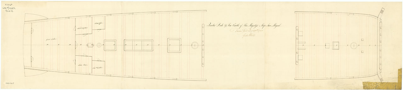 'San Miguel' (1782). Scale: 1:48. Plan showing the quarterdeck and forecastle for 'San Miguel' (1782), a captured Spanish Third Rate, as taken off at Portsmouth Dockyard prior to fitting as a 74-gun Third Rate, two-decker.