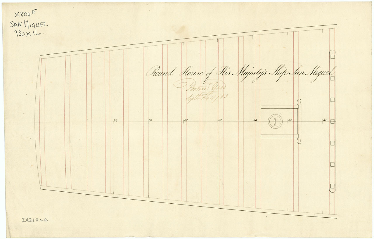 'San Miguel' (1782). Scale: 1:48. Plan showing the roundhouse for 'San Miguel' (1782), a captured Spanish Third Rate, as taken off at Portsmouth Dockyard prior to fitting as a 74-gun Third Rate, two-decker.