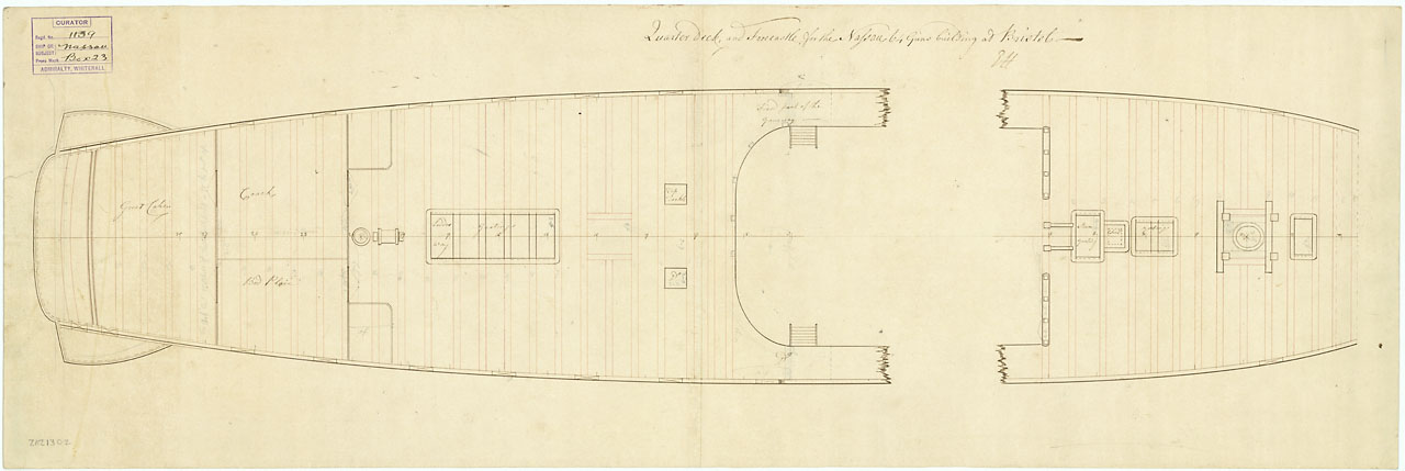 'Nassau' (1785). Scale: 1:48. Plan showing the quarterdeck and forecastle for 'Nassau' (1785) a 64-gun Third Rate, two-decker, building at Bristol by Mr Hilhouse.