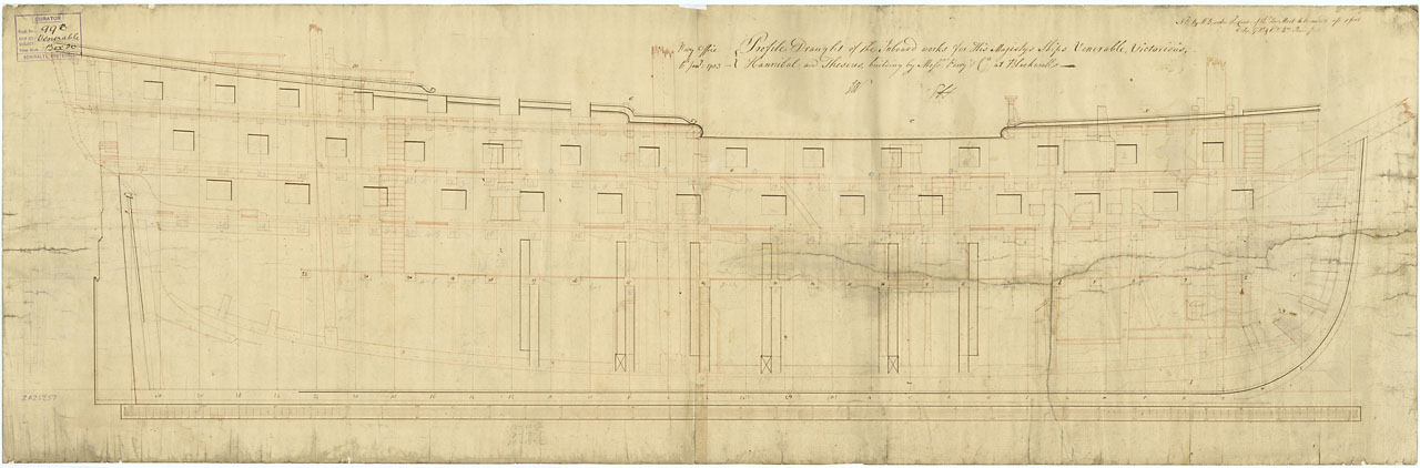 'Venerable' (1784); 'Victorious' (1785); 'Hannibal' (1786); 'Theseus' (1786). Scale: 1:48. Plan showing the inboard profile for 'Venerable' (1784); 'Victorious' (1785); 'Hannibal' (1786