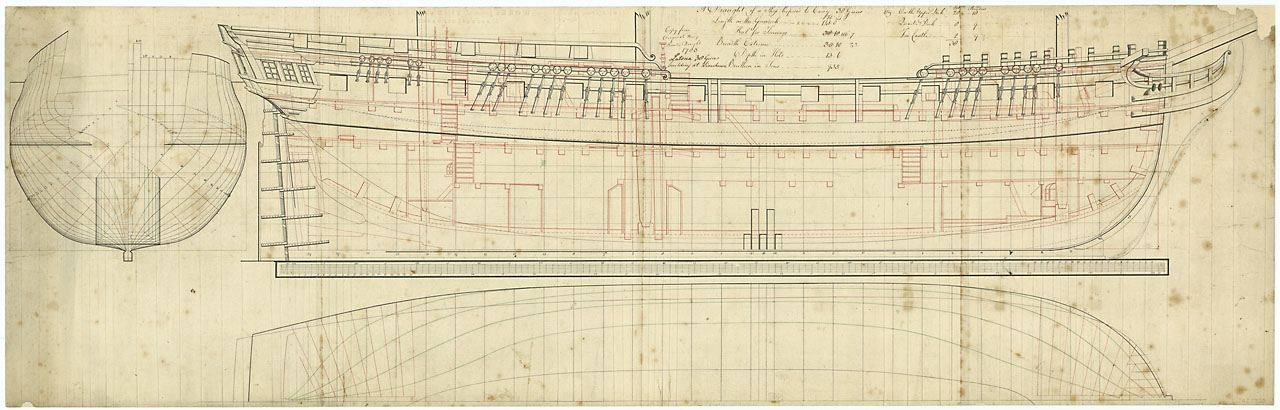 Squirrel (1785). Scale 1:48. Plan showing the framing profile (disposition) for building the Squirrel (1785), a 24-gun, Sixth Rate ship at Liverpool by Mr John Barton. Annotation in top right: "A Copy was sent to Mr Barton of Liverpool 2oth January