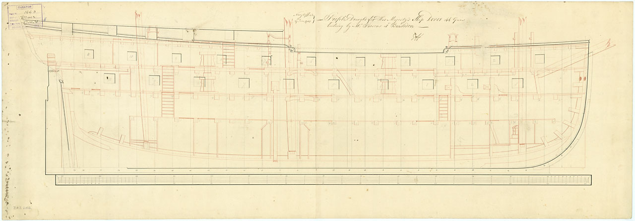 Dover (1786). Scale: 1:48. Plan showing the inboard profile for building Dover (1786), a 44-gun Fifth Rate, two-decker, building at Bursledon by Mr Parsons.