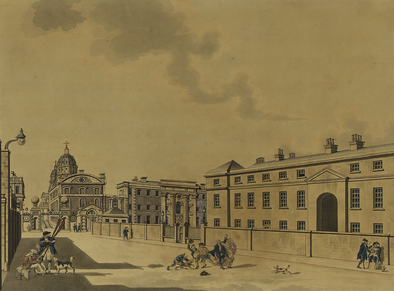 Greenwich Hospital from the West [with the Infirmary]. A view along what is now College Walk, inside the West Gate of the Old Royal Naval College, but showing the gates in their original position close to the buildings, before the area of tenements behind