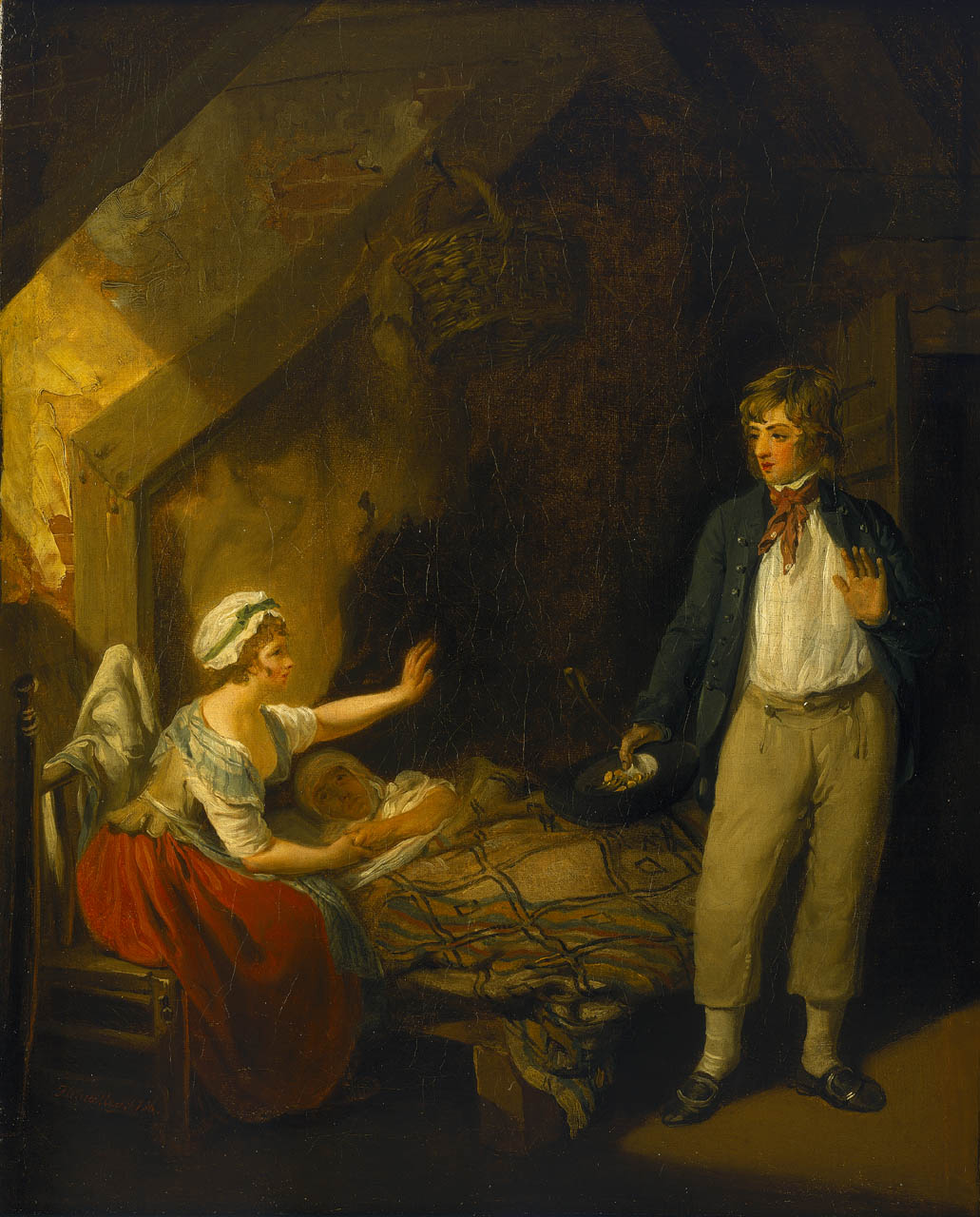 The Sailor's Return. An interior of a small cottage. The truckle bed, simple furnishing, flaking plaster and exposed red brickwork suggest rural simplicity and poverty.