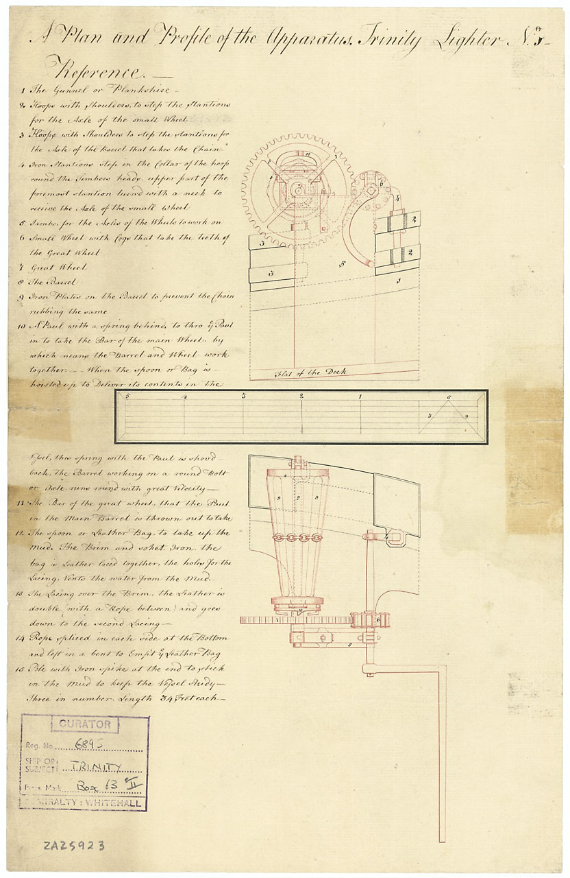 Trinity Lighter Number 1 (1786). Scale: 1:12. A plan showing the plans and elevation of the lifiting mechanism of the dredging apparatus for the Trinity Lighter Number 1, a clinker-built, forty-one foot dredger. The reference key also refers to plan ZAZ