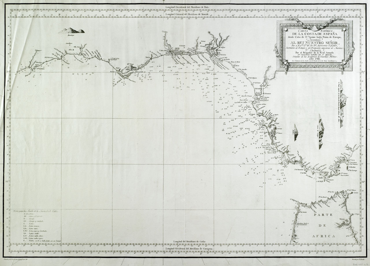 Carte esferica de le Costa de Espania desdo Cabo de St Vicente hasta punta de Europa presentada al Rey Nuestro Senor por el exmo sor Bo Fr Dn Antonio Valdes.. construida Dn Vicente Tofino de San Miguel.. ano 1786 brabado por DJ de la Cruz geogrago de SM e