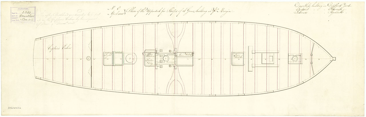 Dauntless (1808); Jalouse (1809); Serpent (cancelled 1810). Scale: 1:48. Plan showing the upper deck plan for Dauntless (1808), Jalouse (1809) and Serpent (cancelled 1810), all 16-gun Ship Sloops. The plan includes an additional after bulkhead within th