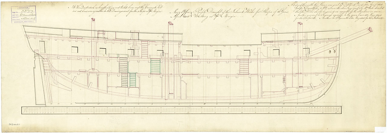 Jalouse (1809). Scale: 1:48. Plan showing the inboard profile for Jalouse (1809), a 16-gun Ship Sloop with quarterdeck and forecastle, building at Plymouth Dockyard. The plan includes alterations to lengthen the quarterdeck and include additional gun por