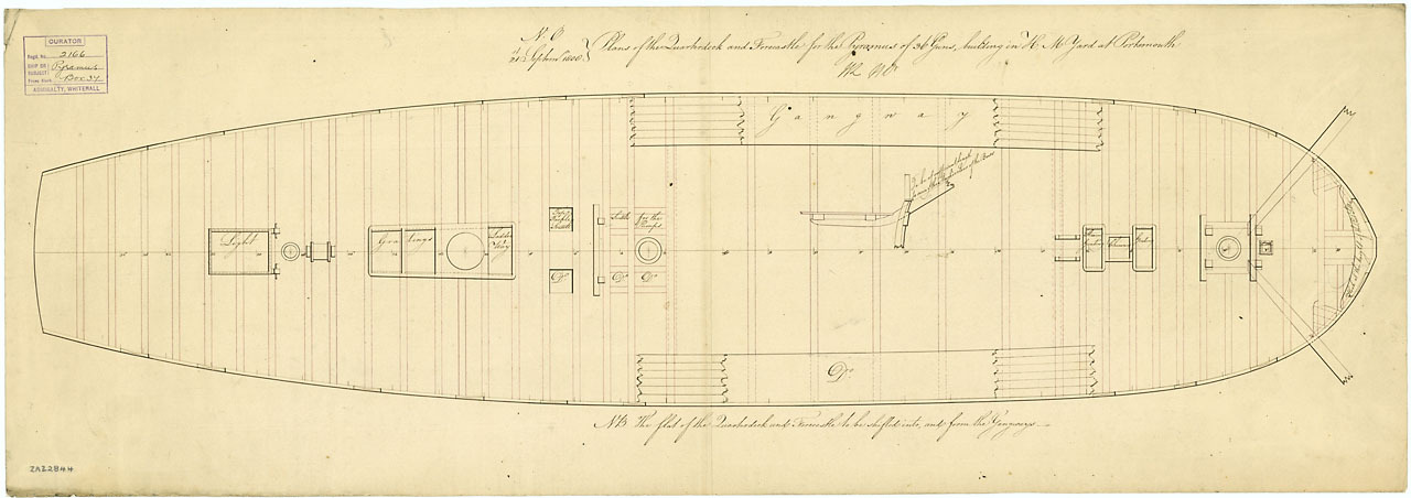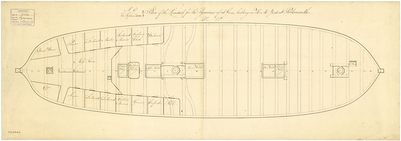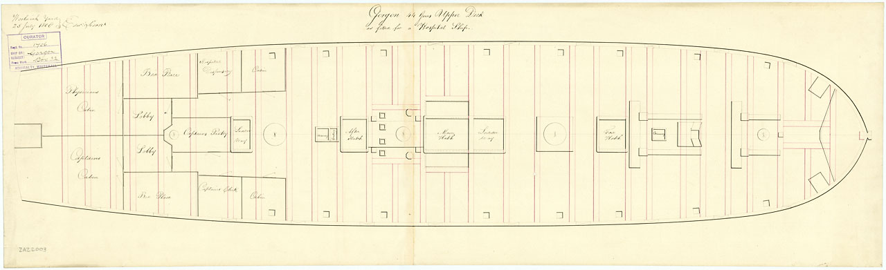 Gorgon (1785). Scale: 1:48. Plan showing the upper deck for Gorgon, a 44-gun Fifth Rate, two-decker, as fitted as an Hospital Ship at Woolwich Dockyard.