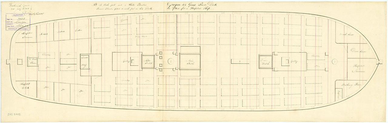 Gorgon (1785). Scale: 1:48. Plan showing the lower deck for Gorgon, a 44-gun Fifth Rate, two-decker, as fitted as an Hospital Ship at Woolwich Dockyard. The plan illustrates the layout of the cradles and the various cabins, storerooms, and washrooms.