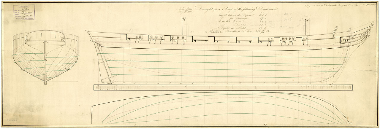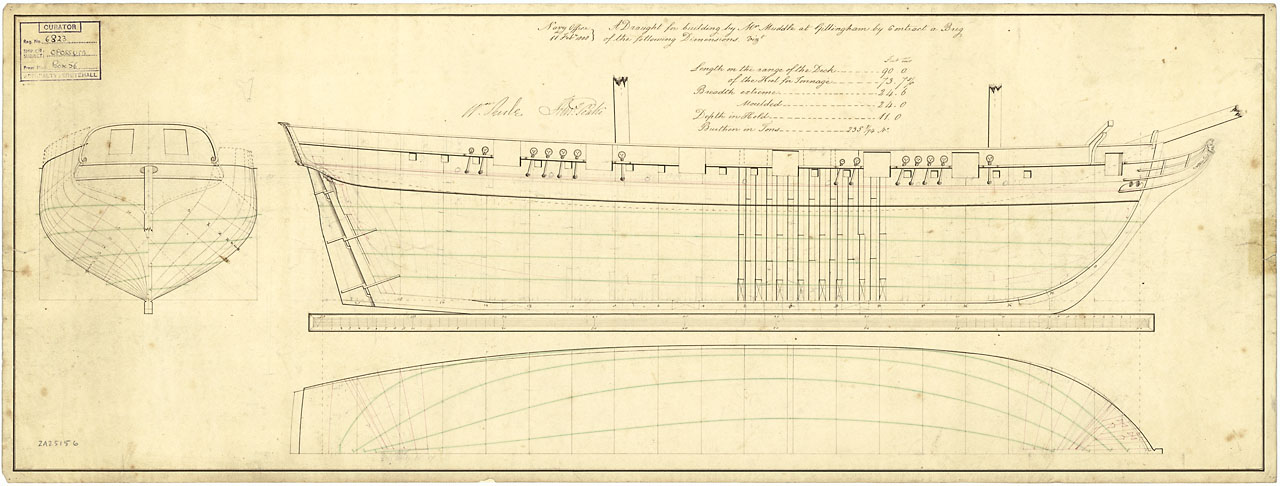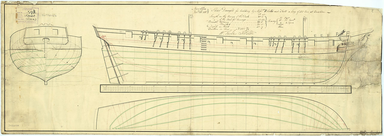 Dotterel (1808) [Alternative spelling: Doterel]. Scale: 1:48. Plan showing the body pan with stern board outline, sheer lines with scroll figurehead/fiddlehead, and longitudinal half-breadth for Dotterel (1808), an 18-gun Brig Sloop (Brigantine) building