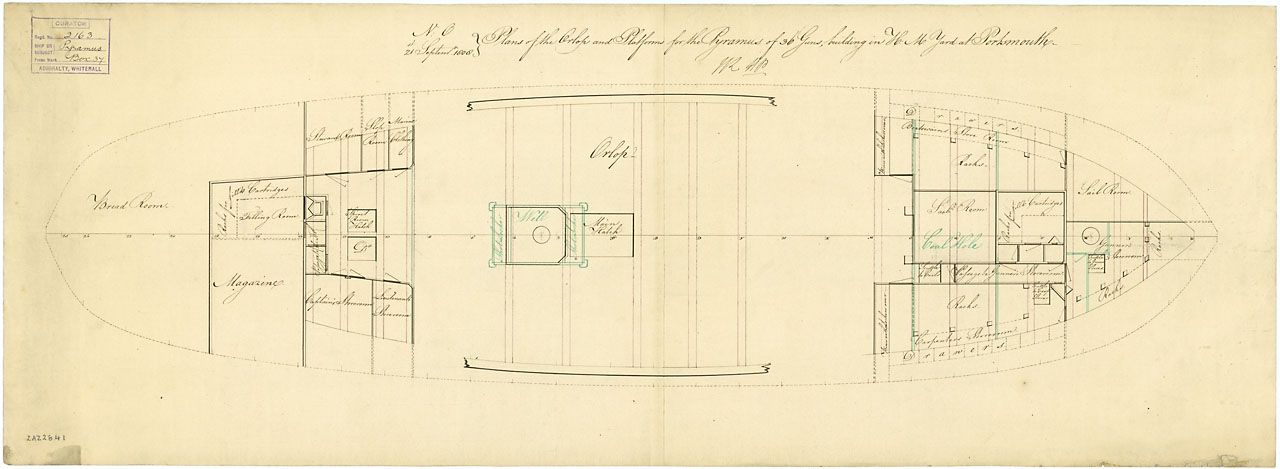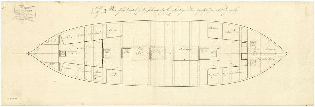 Jalouse (1809). Scale: 1:48. Plan showing the lower deck for Jalouse (1809), a 16-gun Ship Sloop with quarterdeck and forecastle, building at Plymouth Dockyard.