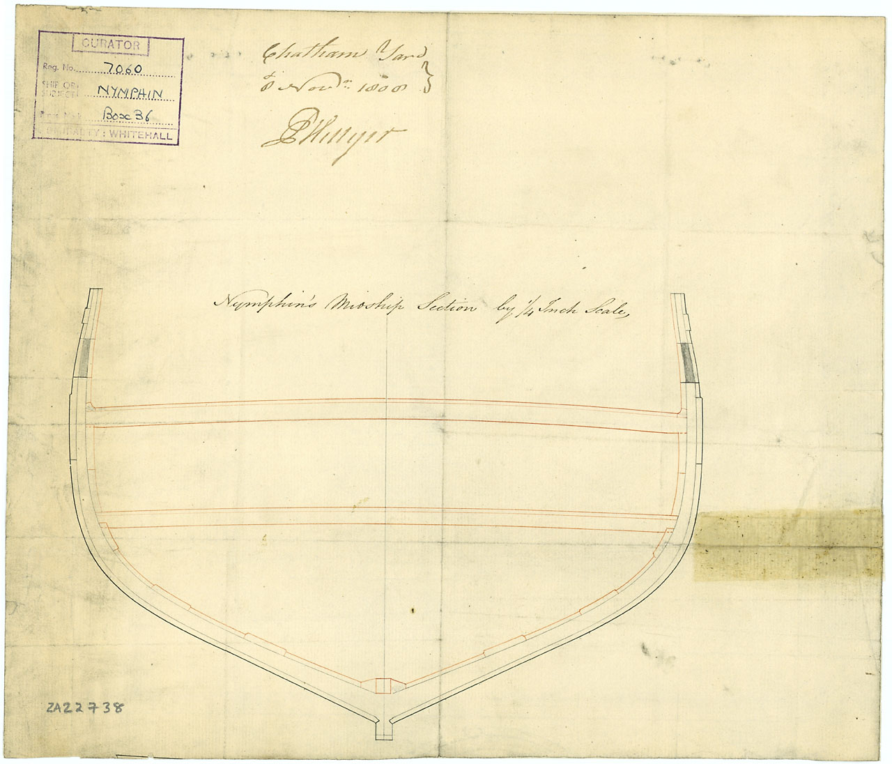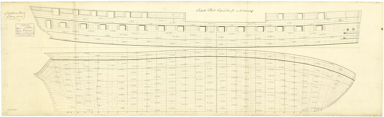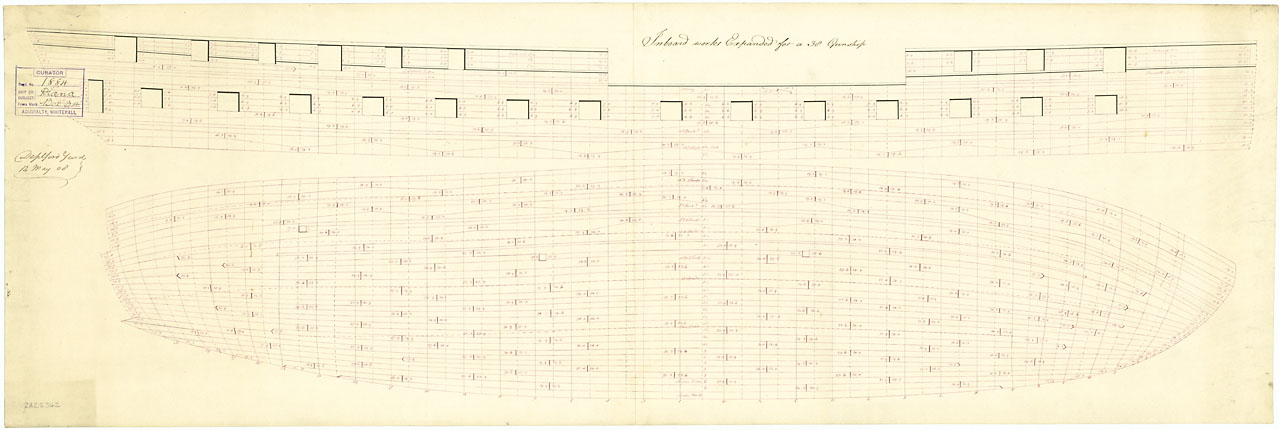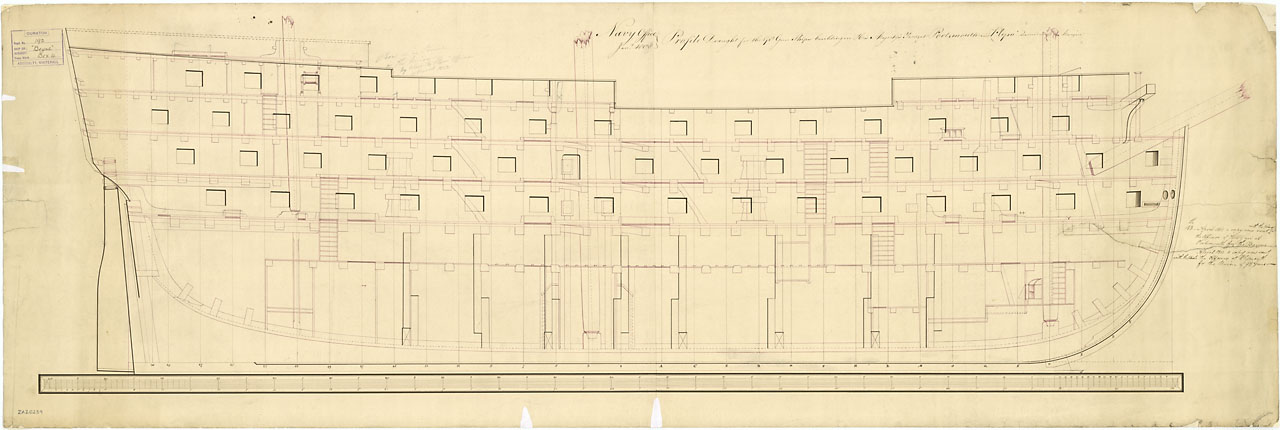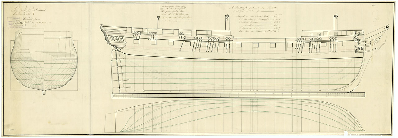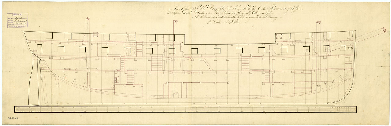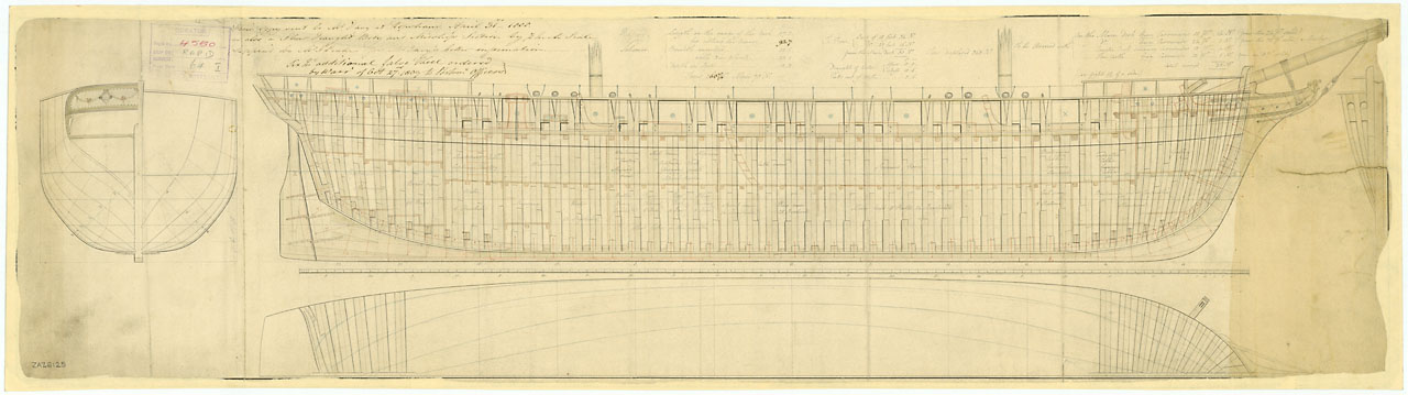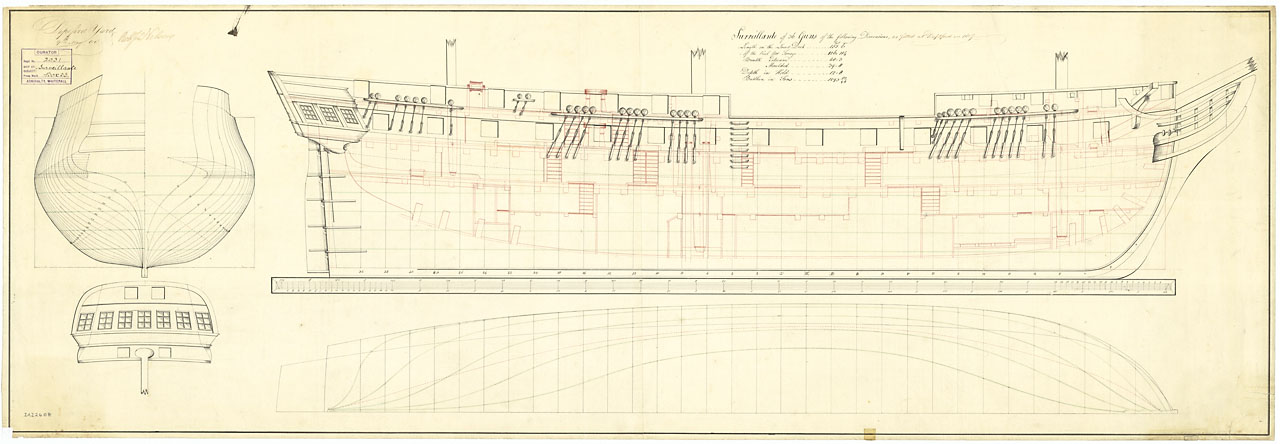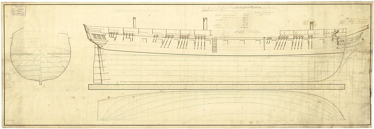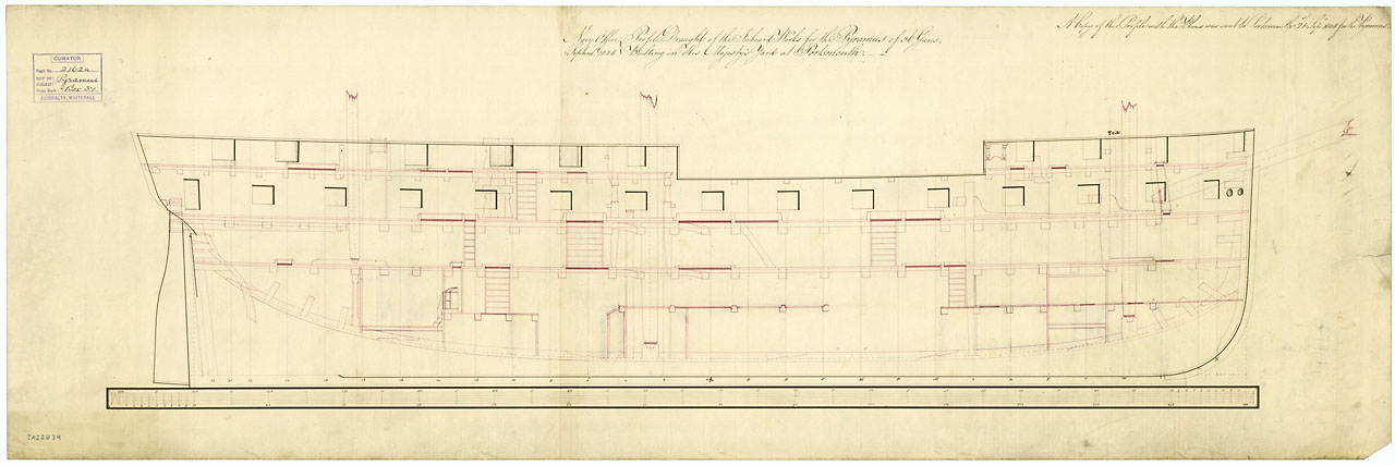 Gorgon (1785). Scale: 1:48. Plan showing the inboard profile for Gorgon, a 44-gun Fifth Rate, two-decker, as fitted as an Hospital Ship at Woolwich Dockyard.