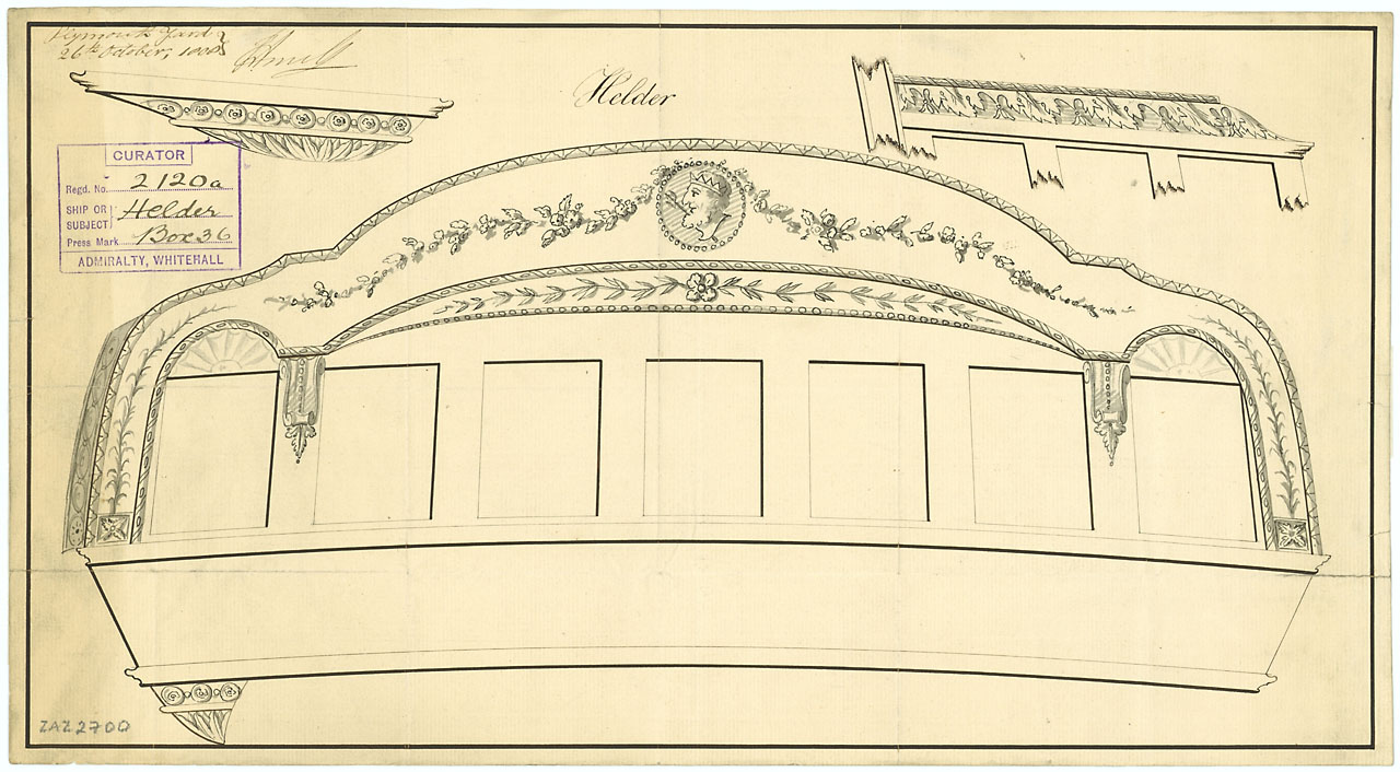Jalouse (1809). Scale: 1:48. Plan showing the stern board above the waterline for Jalouse (1809), a 16-gun Ship Sloop with quarterdeck and forecastle, building at Plymouth Dockyard.