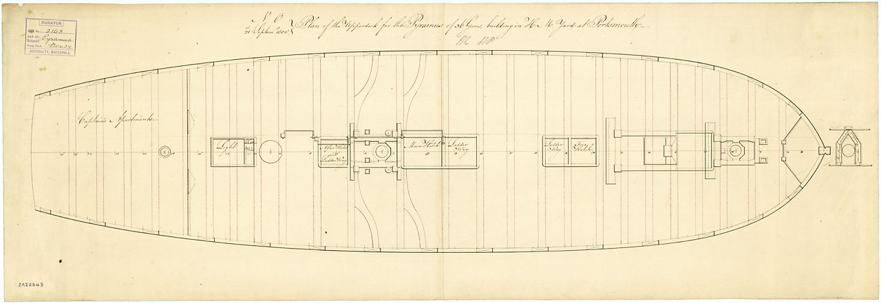 Jalouse (1809). Scale: 1:48. Plan showing the upper deck for Jalouse (1809), a 16-gun Ship Sloop with quarterdeck and forecastle, building at Plymouth Dockyard.