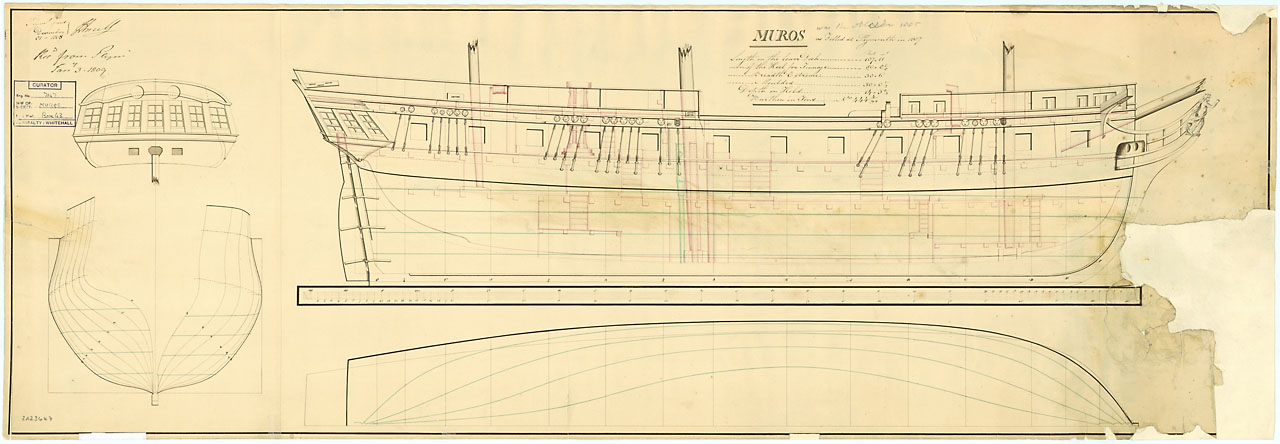 NMM, Progress Book, volume 6, folio 539 states that 'Muros' arrived at Plymouth Dockyard in April 1806, and was docked on 8 April 1807. Her copper was repaired and she was undocked on 9 May 1807, sailing on 18 July having been fitted.