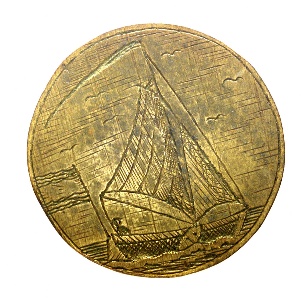 Lighterman's badge. Lighterman's badge. An engraved plate. Obverse: Starboard broadside view of a boat under sail with a lee board, one man in the stern. Reverse: Inscription within a wreath. Legend: 'JOHANNES . Hs . HUNEVELD 30 Ap 1808