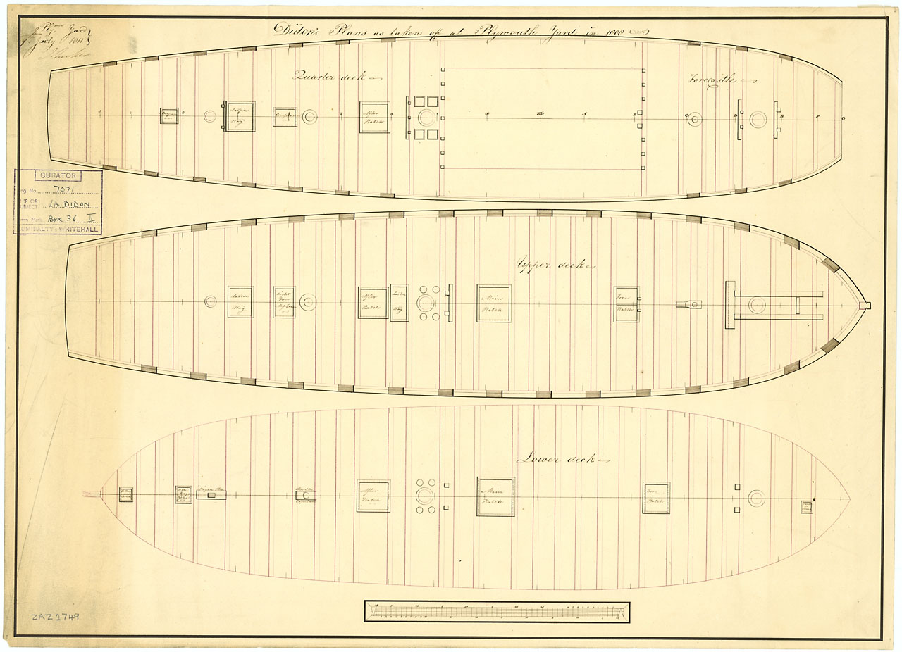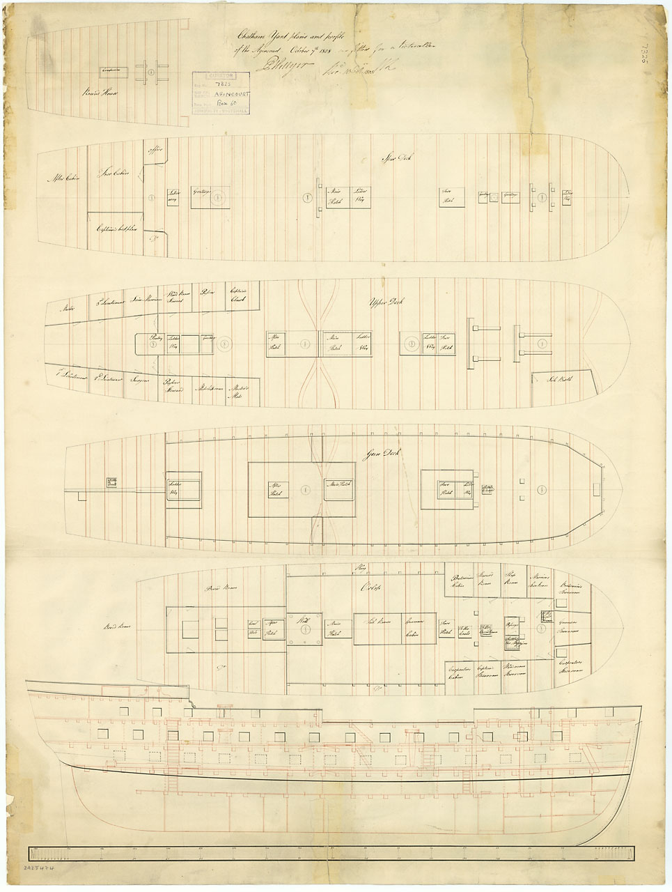 'Union' (1811). Scale: 1:48. Plan showing the middle deck for 'Union' (1811), a 98-gun Second Rate, three-decker, building Plymouth Dockyard.